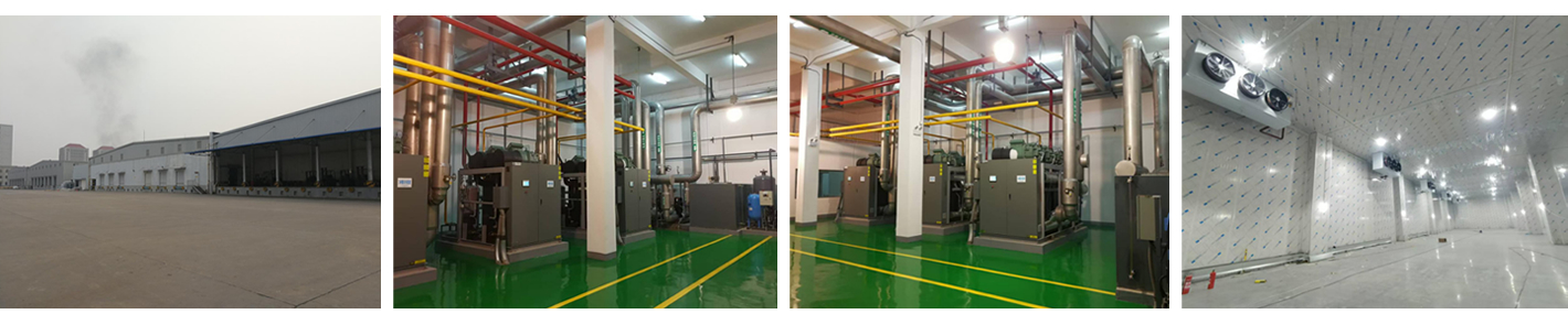 建筑面积10000㎡,层高7米,存储吨位20000吨,3套并联螺杆,共9台比泽尔螺杆压缩机,采用氟+载冷剂制冷,制冷剂为R507,末端冷风机、顶排管,热冷媒冲霜。