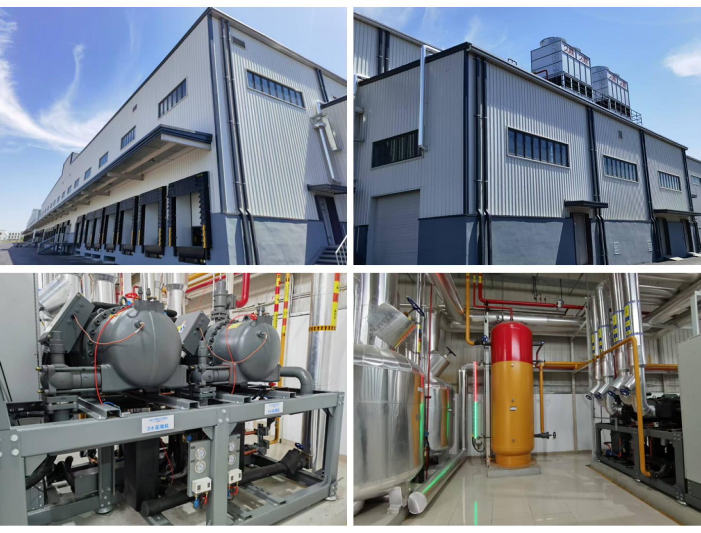 京东天津仓。建筑面积8000㎡,层高10米,存储吨位15000吨,二套两并联机组,采用氟膨胀制冷,R507制冷,末端冷风机,热氟冲霜。仓储冷库。
